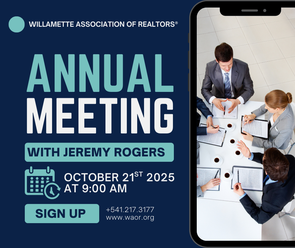 Join us for our Annual Meeting October 21st 9:00 am - 11:00 am | Doors open at 8:30 Cast your vote on the incoming Board Directors. Jeremy Rogers, from Oregon REALTORS will be updating us on all the upcoming changes that are taking effect January 1st. 1 Hour of CE Provider. Light Breakfast Provided